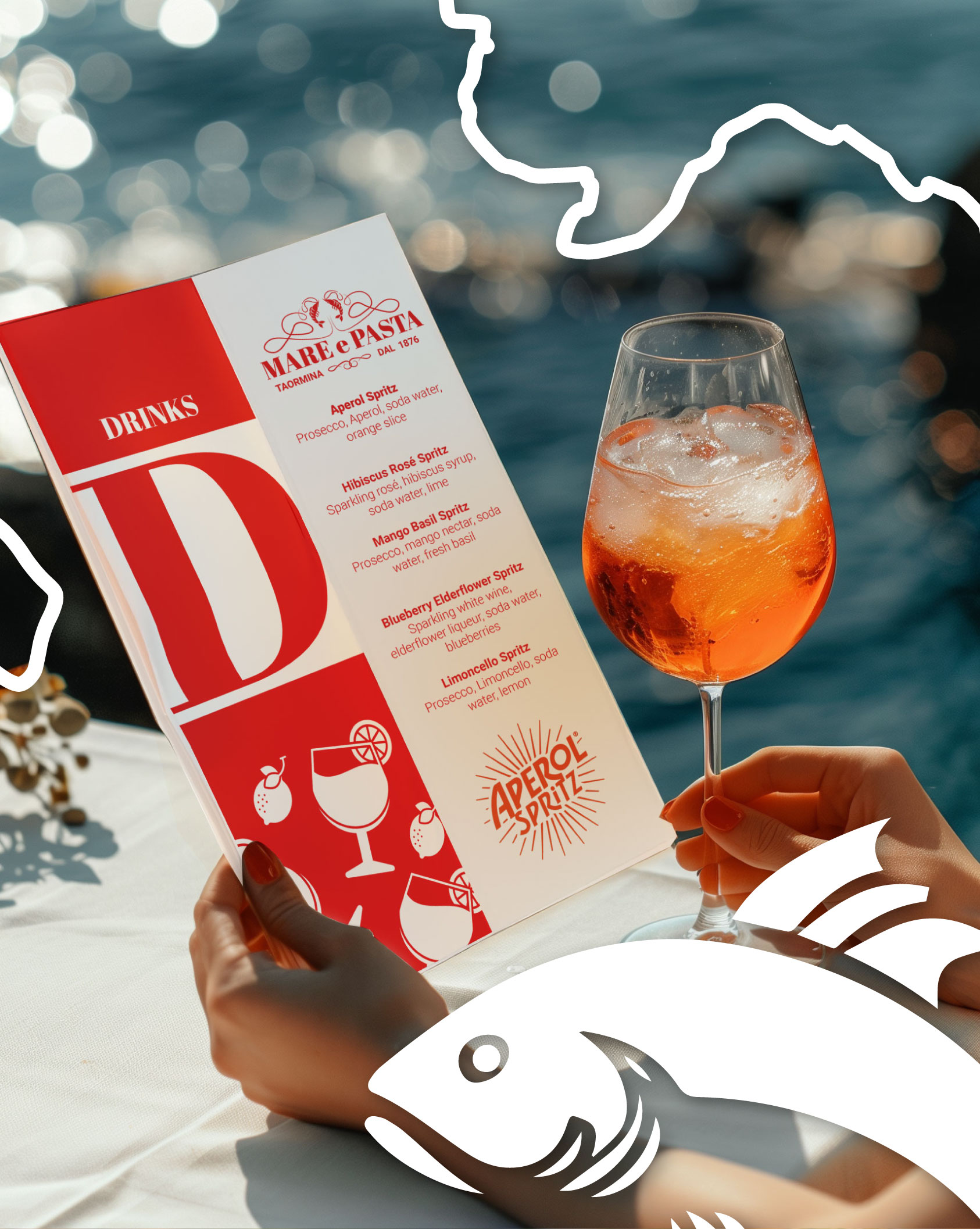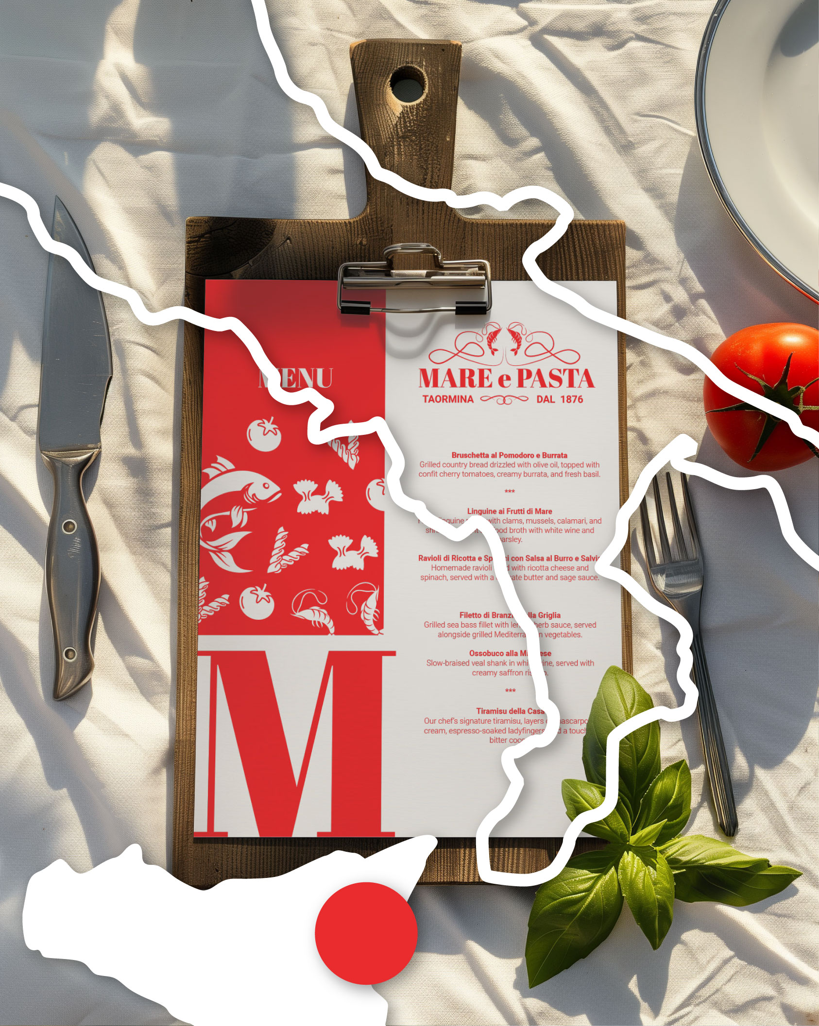 MARE e PASTA est un concept fictif de restaurant situé à Taormina, sur la côte sicilienne, perché sur les falaises avec une vue imprenable sur l’Isola Bella. Ce lieu chic mais convivial célèbre la cuisine italienne dans toute sa générosité, des produits de la mer frais et des pâtes maison préparées avec passion. L’identité visuelle que j’ai imaginée traduit cette ambiance en mêlant raffinement méditerranéen et gourmandise italienne. La palette repose sur un rouge tomate vibrant, évoquant à la fois la chaleur du soleil sicilien et l’appétit. La typographie, ample et accueillante, rappelle la générosité de la table italienne, tandis qu’un ensemble d’icônes culinaires illustrées vient ponctuer l’univers graphique, ajoutant une touche artisanale et conviviale. Le résultat : une identité élégante, ensoleillée et savoureuse, qui donne envie de s’attabler face à la mer pour savourer un plat de pasta accompagné d’un Aperol Spritz.